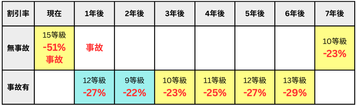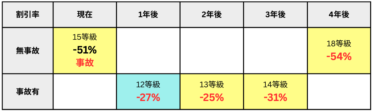 また、この期間中に再び事故を起こしてしまうと、最長6年まで延長されます。■3等級ダウン事故のあと、無事故だった場合