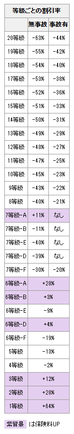 等級は数字が小さいほど割引率が小さく(1~3等級は割増)=保険料が高く、数字が大きいほど割引率は大きく=保険料が安くなります。※右図は一例です。保険料の割引率は各保険会社様に直接お問い合わせ下さい。